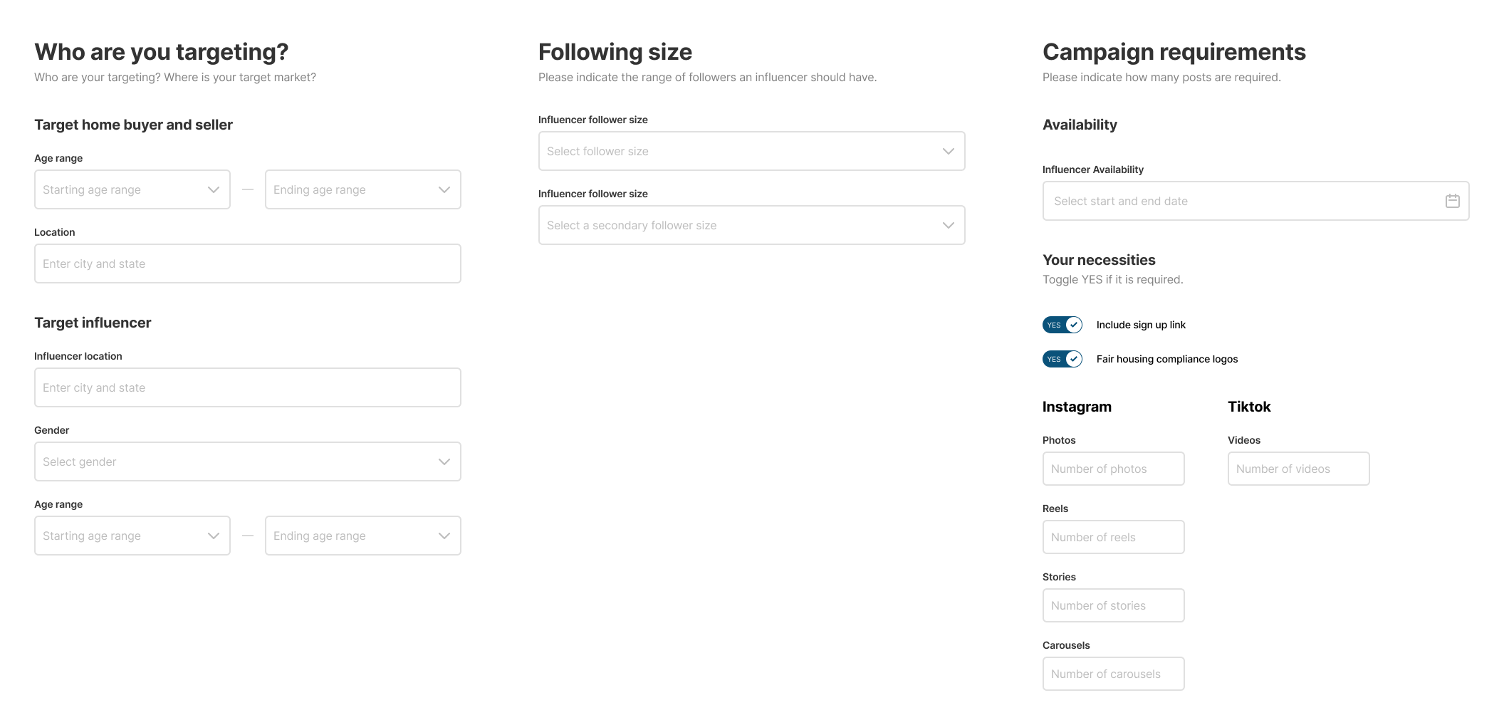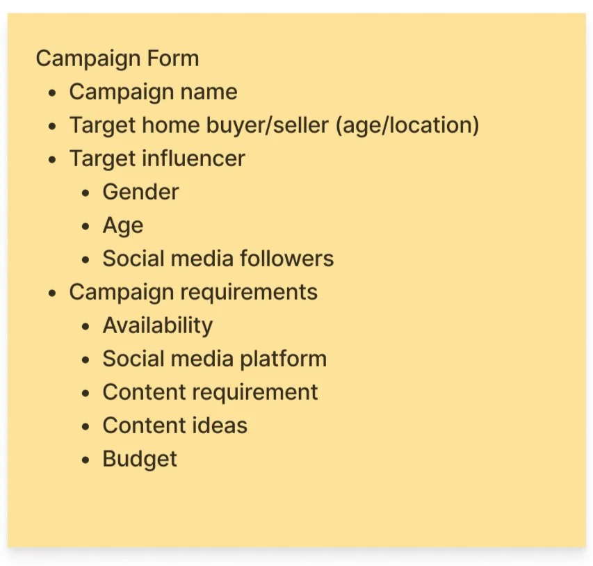 The goal was to design a digital platform that enables real estate professionals—agents, architects, and contractors—to collaborate with social media influencers on targeted marketing campaigns. These collaborations could be: